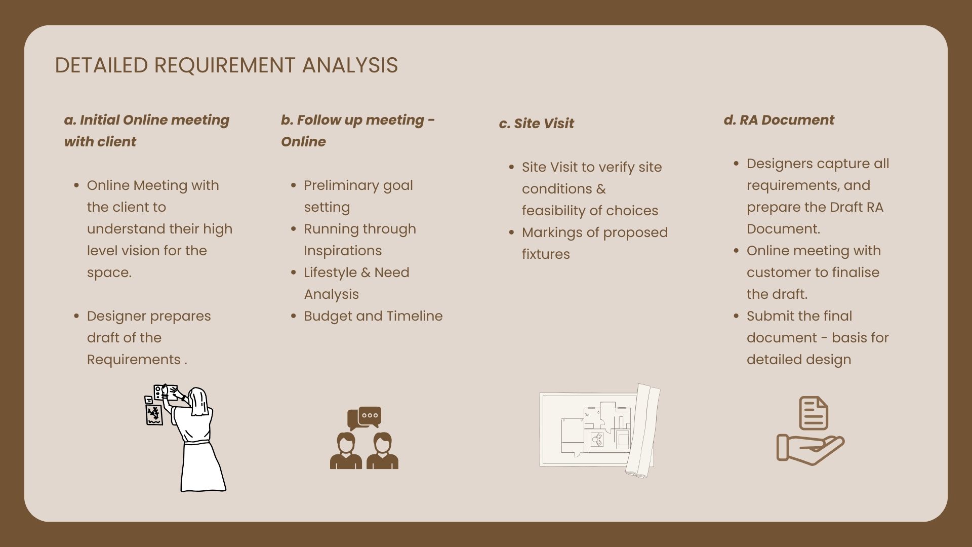 The requirement analysis process in an interior design project is a foundational step where the designer gathers and interprets the client’s needs, preferences, and lifestyle to develop a clear understanding of the project’s goals. It ensures that the final design aligns with the client’s vision, functional needs, and budget.